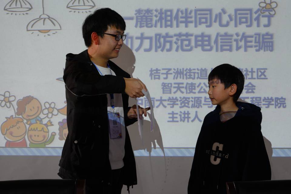 活动伊始,主持人张雅琨通过PPT讲解和现场互动的方式,针对目前最常见的几种骗术,结合日常案例来揭露各类犯罪技俩,对电信诈骗的相关知识进行了基本讲解。参与活动的儿童在讲解过程中与主持人进行了积极的互动和讨论,在讲解过程中结合自己的经历收获了不少预防和防范电信诈骗的知识。为提高儿童兴趣,志愿者们采用分组互动表演的方式,和儿童们一起演绎了不同情况下电信诈骗的情景短剧,现场气氛轻松欢快。活动最后,志愿者们为参加本次活动的儿童们赠送文具,希望他们能在宝贵的童年里树立防范意识,继续茁壮成长。活动结束后,志愿者对每一位到场的儿童进行了采访,在采访中,儿童们已对电信诈骗有了较为清晰的认识,也掌握了应对生活中的电信诈骗的方法。