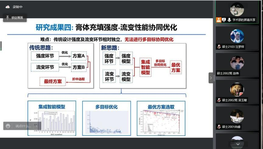 接着齐老师简要阐述了他的研究成果,包括絮凝沉降效果预测分析、膏体充填材料单轴抗压强度智能推演、充填料浆环管输送智能预测、膏体充填强度——流变性能协同优化等,极大地改进了传统膏体充填设计流程的速度与精度。