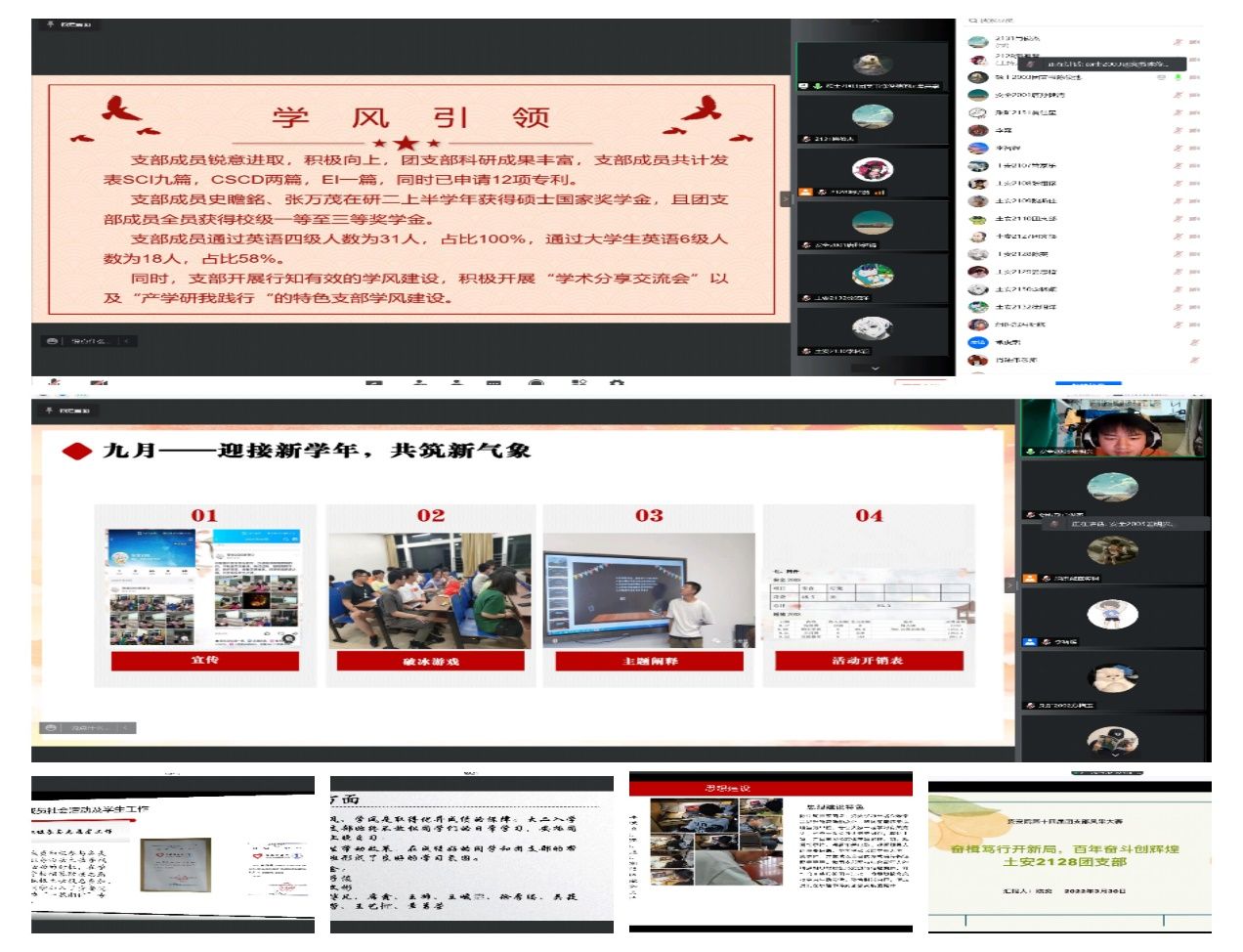 本次大赛主题为“奋楫笃行开新局,百年奋斗创辉煌”,共分为现场答辩和评委提问两个部分。22支团支部队伍幷驱争先,在答辩的五分钟时间内,展现各支部的风采。虽然受疫情影响,团支部无法现场展示自我,但是通过图文和视频,评委老师和各位同学也能深切感受到各团支部的活力和凝聚力,展示出学院基层团支部健康、积极、乐观、向上的形象。各团支部主要就支部基本情况介绍、组织建设活动、学风建设、社会实践活动四个方面进行汇报,同时结合各支部特点进行延展、创新,充分展现了青年团员组织生活的能动性和创造性。答辩结束后,评委老师就各参赛团支部的自荐材料与答辩情况进行提问,充分发掘了各团支部风采活力。