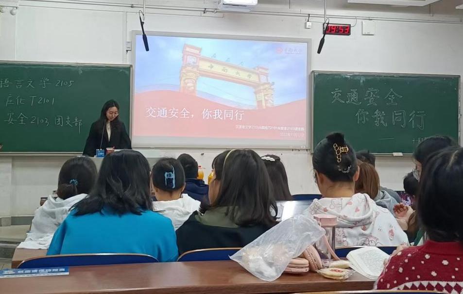 2022年11月13日,三班团支部在新校区A座101召开了主题班会,以影片观看、PPT讲解、观看安全宣传视频等三种方式来推动交通安全的宣传教育。在活动过程中,汉语言文学2105班团支书李珅同学结合PPT就事故发生的原因及其影响交通安全注意事项交通事故处理方法三个方面展开讲述。她结合近期交通事故真实案例,用通俗易懂的语言加深同学们对交通事故危害性的认识讲解结束后,同学纷纷表示受益匪浅