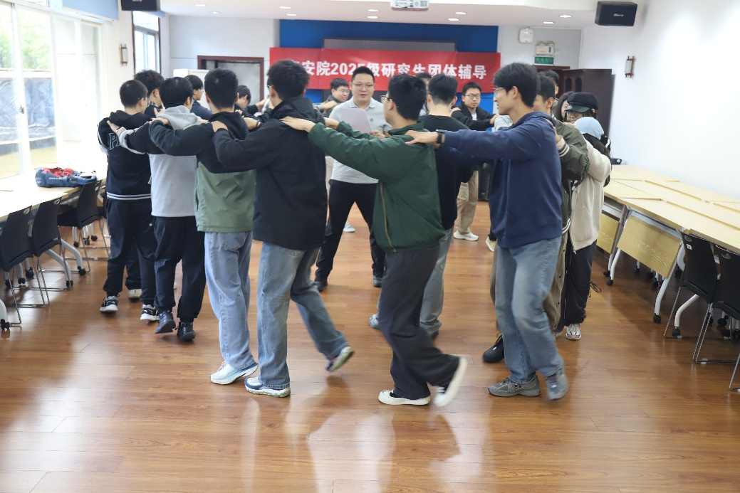 活动伊始,研究生辅导员丁德孝老师、王子涵老师简要介绍了整体流程。通过“揉肩操”热身环节迅速拉近了同学们之间的距离。随后同学们按规则完成分组,开始“滚雪球”环节。各小队成员围坐一圈,从任意一名同学开始做自我介绍,后续同学需依次重复前面所有成员的介绍内容,直至最后一人完成复述。同学们的关系在游戏中不知不觉间变得更加亲密。