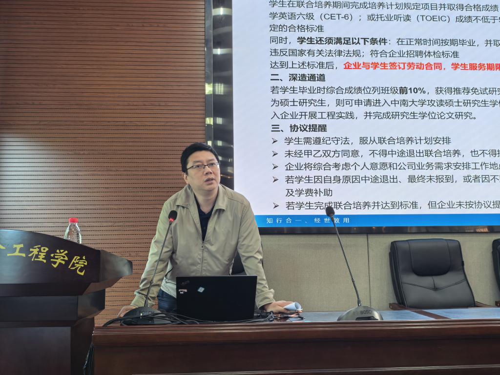 会上,黄锐副院长围绕紫金班培养体系,从基本要求、培养目标与方式、资助政策与就业衔接等方面进行系统介绍,结合专业培养方案优化历程和行业发展趋势,勉励同学们紧扣国家战略需求,深耕矿山领域,努力成长为兼具专业素养和国际视野的高素质矿业人才。