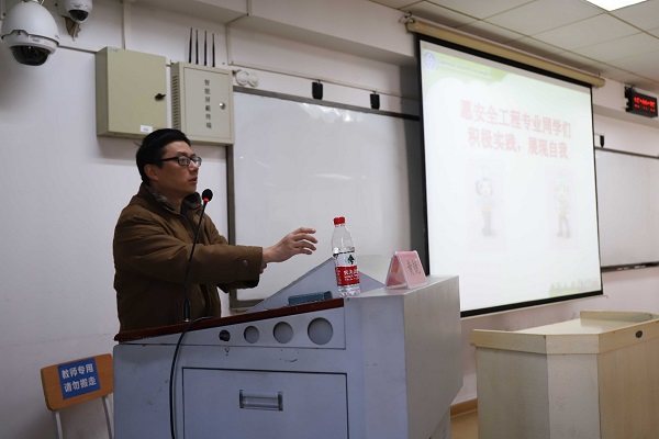 资安院黄锐副院长从作品大赛介绍、参赛作品类别、评审与奖项以及安全学科职业前景等方面进行了指导。首先,对安全专业的同学们寄予了“积极实践,展现自我”的期望,鼓励同学们积极参与,期望广大同学发扬创新精神,提高实践技能。随后,根据作品大赛的各个环节一一进行阐述,并围绕大赛各个时间点的注意事项展开逐一地讲解。最后,向同学们详细地指导了安全学科职业前景,同时以优秀校友事例分别从安全学科交叉综合、安全生产人才类型、安全发展主要领域以及可拓展的安全发展领域等四个方面深入的为同学们介绍安全学科发展和未来。