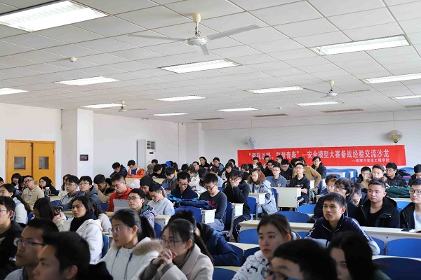 交流会首先由2016级安全工程优秀学生,全国高校安全科学与工程大学生实践与创新作品大赛一等奖获得者王渊洁发言,他从自己宝贵经验和心路历程出发,分享了作品大赛整个环节的故事和点滴,同时在整个发言的过程中,向同学们重点的讲解了团队组建,确定题目,补充说明等重要环节。与会同学被王渊洁轻松的言语所感染,现场互动频繁。最后,王渊洁提醒同学们要勇敢探索,不忘初心,要做到积极与老师沟通交流,同时鼓励大家积极参加本届大赛。