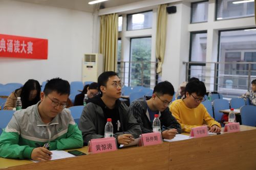 “传承红色基因,不负青春使命”红色经典诵读比赛在新校区B座105教室圆满落幕,此次比赛邀请了院研究生会主席孙仲期、副主席李柏锦、院团学会办公室主任夏简强以及黄惊涛同学担任评委。
