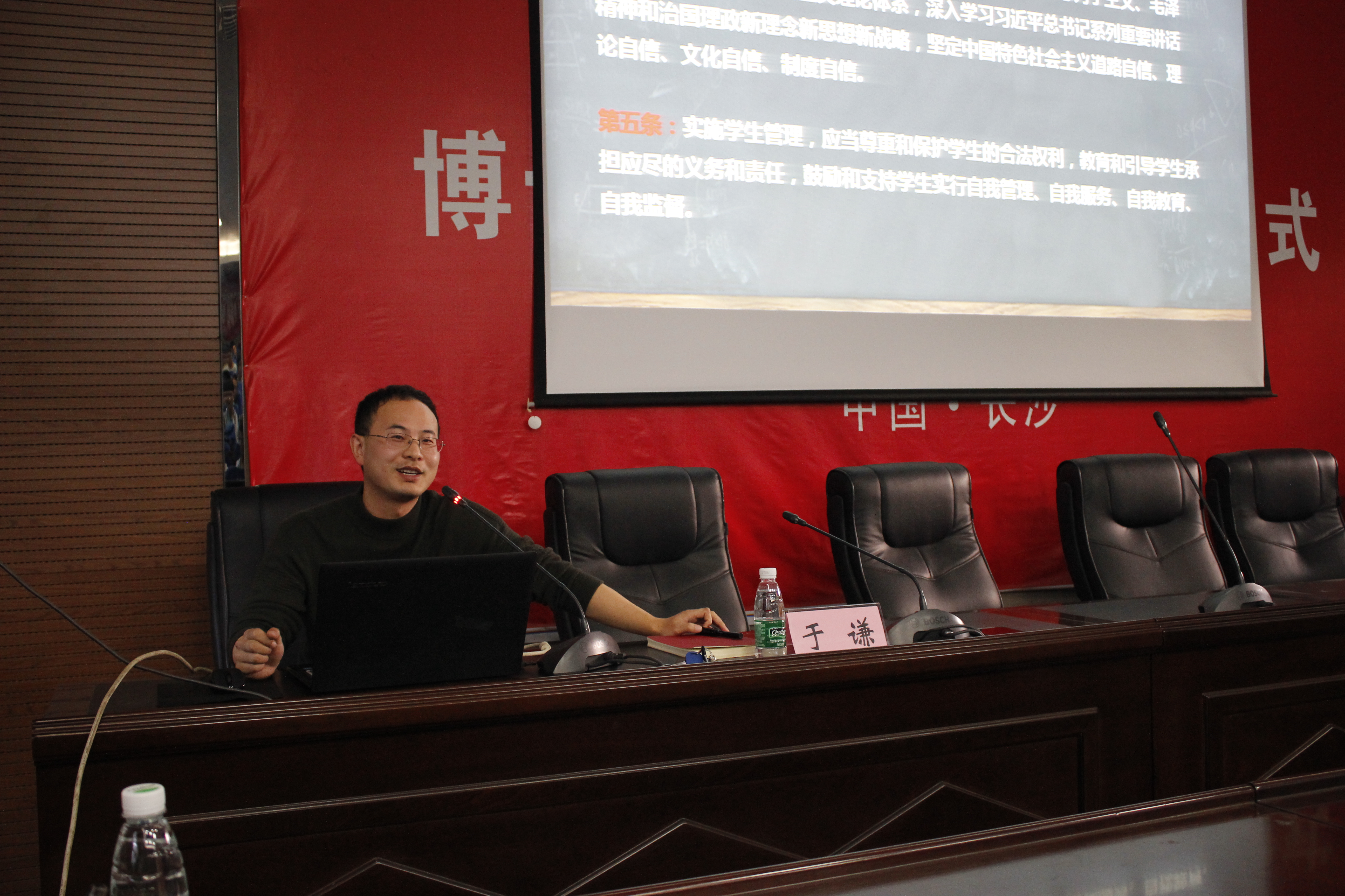 会上,于谦老师着重从校纪校规、安全教育、评奖评优、求职就业、日常管理五个方面进行了阐述。