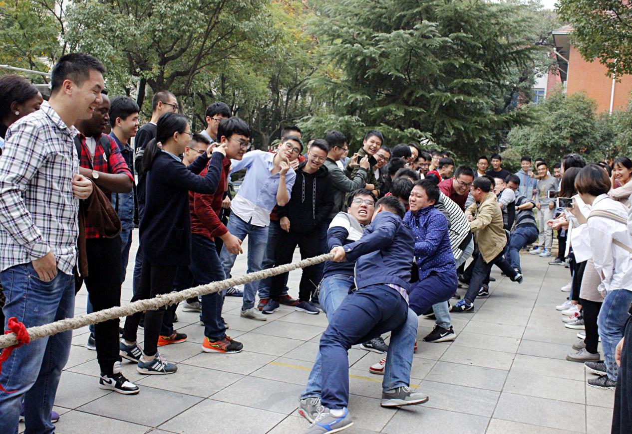 本次活动采取“小组赛-复活赛-半决赛-决赛”的形式进行,每队每局上场人数为10人,共计七支队伍分为A、B、C、D四个小组进行角逐。考虑实际情况,每轮结束后各队可轮换阵容,导师以抽签的形式加入各班队伍与同学们“通力合作、拔出精彩”。比赛过程中,参赛队员和导师双手紧握长绳,团结一心,卯足了劲向后拉,未参赛的同学以及老师们自发组成啦啦队为参赛者高喊加油,活动现场呐喊声此起彼伏。在激动人心的决赛环节,绳索两端的队伍胜负难分,双方都毫不退却,咬紧牙关,坚持到底,拉拉队们也难掩激动,恨不得亲自上阵,现场气氛十分热烈。最终,硕士1601班夺得本次拔河比赛的冠军,硕士1703班、硕士1602班分别获得了亚军和季军。