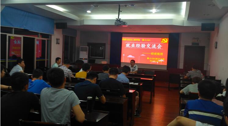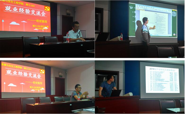 2017年5月18日晚,硕士1501班联合硕士1501党支部于采矿楼227成功举办了“‘毕业季’师兄和你说”主题交流会。本次活动邀请到研究生辅导员于谦老师为大家分析毕业生就业方向并提出职业规划建议,学院2017届优秀毕业研究生刘栋、龚永超和徐金国作为主讲人,结合研三生活从不同方面为同学们带来了精彩的演讲与展示。