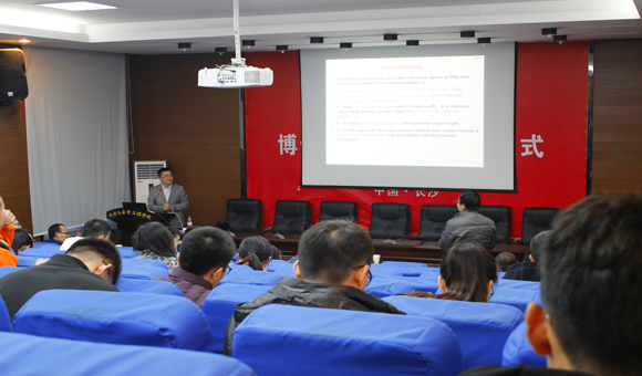 本次讲座的主题为Breakdown Pressure Prediction wit-h Weight Function Approach。讲座伊始,董陇军副教授表达了对金晓春教授的热烈欢迎后,金老师开始了他的专题讲座。首先,金老师简要介绍了自己的教育背景,并提到自己创立公司的经历,向老师同学们展示了公司研究的各种项目。随后,讲座进入到了主体部分,金老师围绕“破裂压力预测”这一主题,介绍了其首次运用Weight Function方法推导出井筒周边对称和非对称裂缝的应力集中因子的解析解,并且将该解析解与数值解进行对比。同时,还首次运用实验结果和第三方模型验证了所推导出的这一解析解。