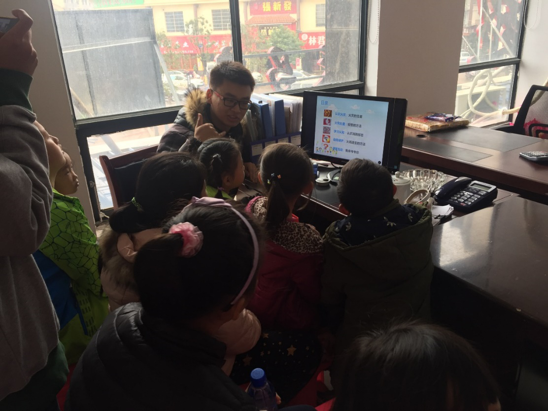 课堂第二个环节为消防安全教育。所有孩子们围聚在一起,由志愿者放映ppt并加以讲解,孩子们专心听讲,并时而提出自己的观点,课堂气氛活跃。在志愿者们的努力下,孩子们从课堂中学到了许多消防安全及自救知识,纷纷为志愿者老师拍手称赞。转眼到了下课时间,志愿者的第一节课也画上了句号。在临结束时孩子们纷纷不舍道:“哥哥,下次你们一定都要来哦,我们想跟你们一起度过周末!”