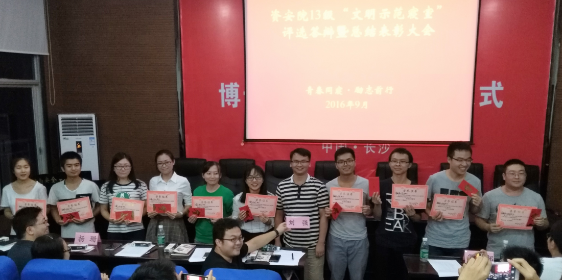 2016年9月10日晚7点30分,资安院13级“文明示范寝室”评选答辩暨总结表彰大会在校本部采矿楼302举行。13级班导师彭述权老师、杨珊老师,学工办主任李欢老师、辅导员朱玮老师、刘强老师以及优秀学生代表到场参会并担任评委。