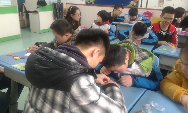下午一点左右,“爱心特教队”在资安院文法楼下集合乘车前往位于长沙市汽车西站附近的长沙市特殊教育学校。经过校方安排,队员分为两组,分别前往培17班与培18班,努力用互动游戏真诚地感染这20几位小朋友们。17班的教室里,小朋友们开心地进行自我介绍,并与一队队员开展“一对一”或“一对二”的活动:拼图游戏、橡皮泥塑形、彩色画、折纸、亲密合影。18班在操场上,与二队队员一起上着他们的室外课,一阵阵欢笑飘扬,一片片童真荡漾。学校的老师们看在眼中,向队员们表示感谢与赞扬,并希望他们以后有机会还能再来。一位殷姓老师说:“你们来过一次,孩子们都会记得,会念着你们想着你们。”