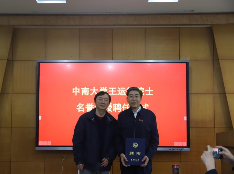 关于聘任王运敏院士为我校名誉教授的决定》,并由胡岳华常务副校长为其颁发聘书,授予校徽。
