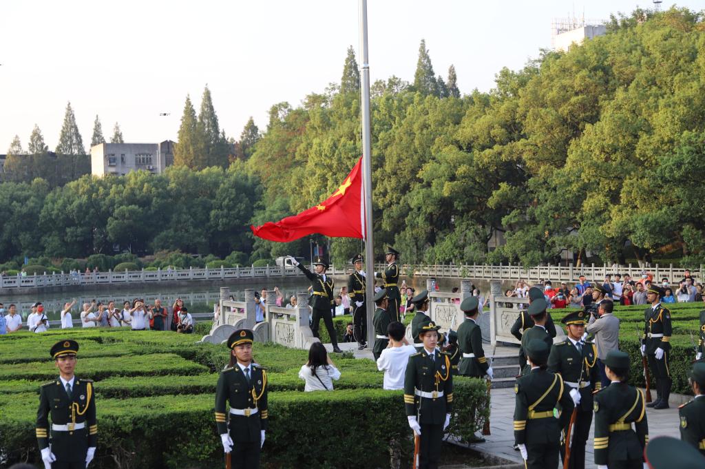 随后,在主持人的宣布下,升旗仪式正式开始。国旗护卫队的队员们在庄严的军乐声中簇拥着五星红旗,在全体师生的瞩目下将国旗郑重地护送到升旗台。在国歌合唱团的领唱下,全体师生奏唱国歌,在秋日的晨光下,五星红旗冉冉升起。