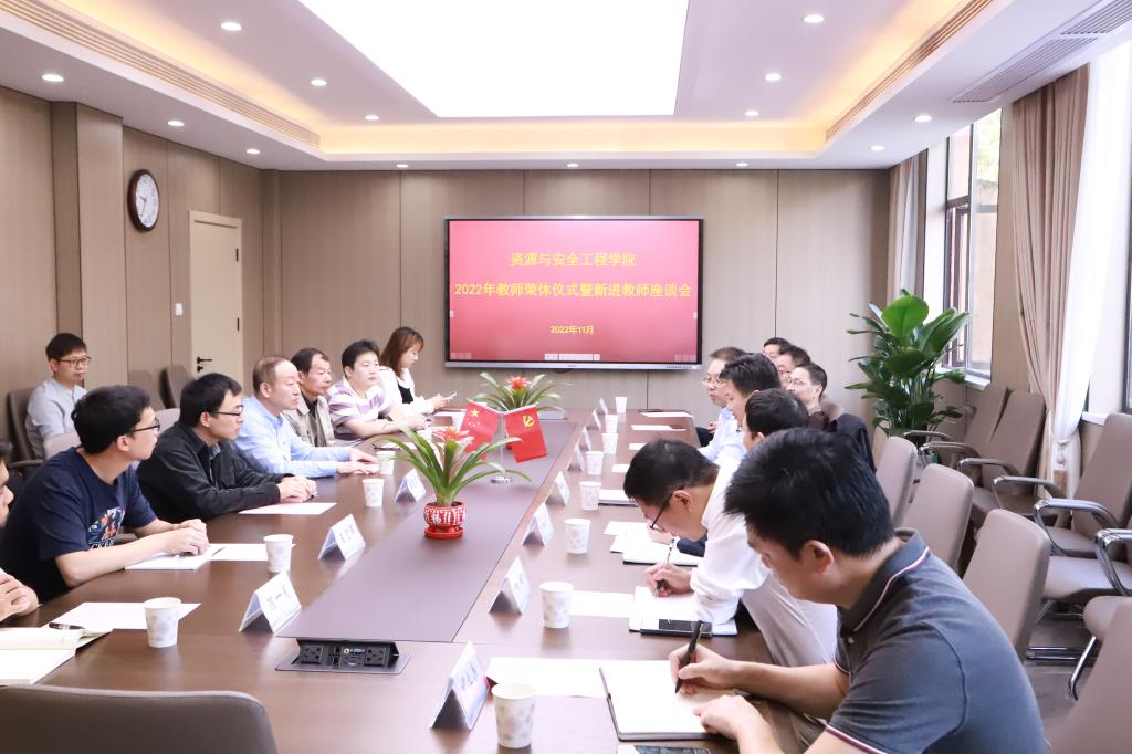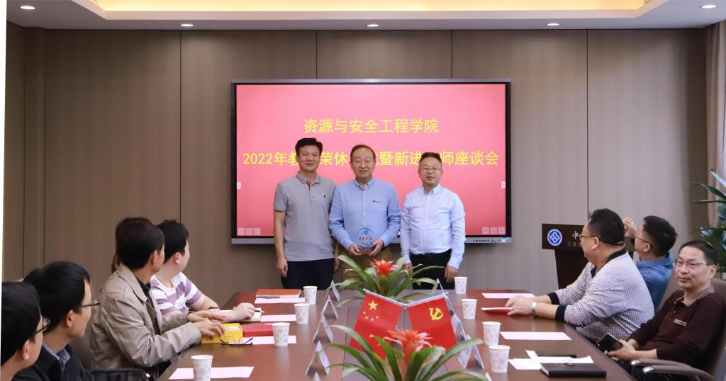 于采矿楼222会议室举行教师荣休仪式暨新进教师座谈会,学院领导班子、2021年以来退休教师以及新进教师参与本次座谈会。此次座谈会由学院党委书记欧旭理主持。