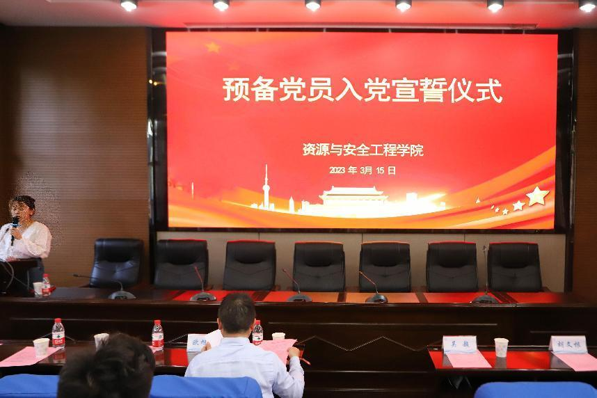 预备党员入党宣誓仪式于采矿楼T302报告厅隆重举行。会议由院党政办李沁媛主持,院党委书记欧旭理出席,马克思主义学院胡文根老师授课。