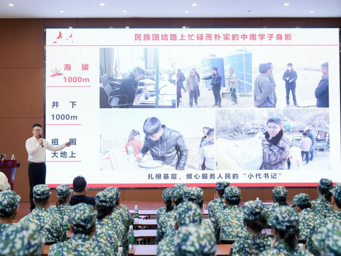 一代代中南学子在“知行合一,经世致用”的校训影响下,与新时代同向同行、共同前进,把个人的理想追求融入党和国家事业之中。博士研究生吴照浩从三个维度讲述了中南学子奋进的故事:代东援主动申请到最偏远、最艰苦的地方,扎根海拔千米之上的南疆小镇,用青春和汗水浇灌着民族团结的绚烂花朵;而在地下千米深处,芮艺超则面对着近50度高温的极端环境,扎根于研发微震监测系统科研的最前沿。吴照浩也分享了自己连续多年深入乡村,开展乡村振兴的调研与实践,用智慧和汗水为乡村的繁荣与发展贡献着自己的力量的故事。这些感人至深的事迹鼓舞激励着一届届中南学子,照亮了他们前行的道路,诠释了中南学子昂扬向上的精神风貌。