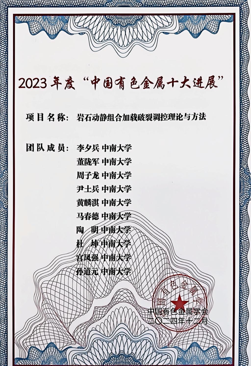 李夕兵教授团队完成的“岩石动静组合加载破裂调控理论与方法”项目成功入选。授奖仪式依托于中国有色金属学会八届四次理事会于2024年12月16日在广州进行。